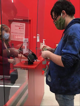 Caden Holler, a customer at the Albany Target store, is seen purchasing items at checkout. Both him and the cashier are seen in masks as he exchanges cash, paying for his items.